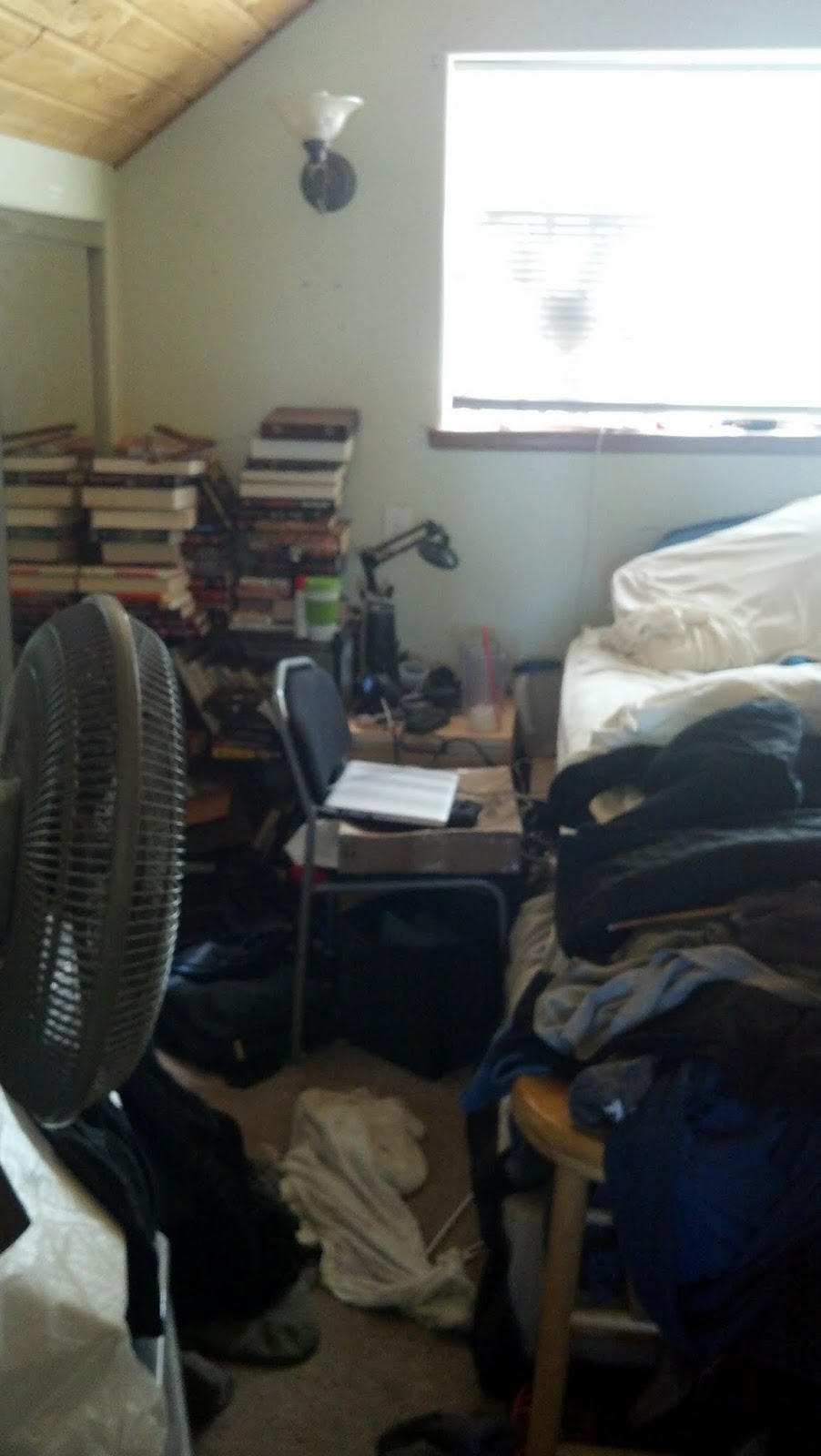 - Take out anything that doesn't belong. All papers, all office equipment except internet connection equipment. Bedroom is for sleeping (and other related activities), clothing, and getting ready in the morning. Chris's laptop must stay because, well, it must.